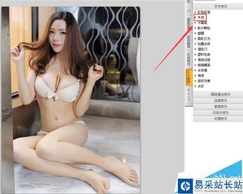 6、點擊PS特效后,進入PS特效的操作界面,在這個界面的上面找到木刻選項,如圖所示: