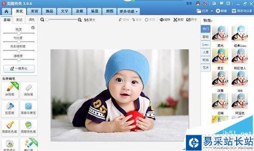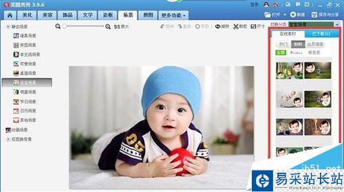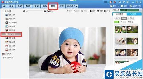 5、我們在美圖工具欄選擇“場景”,可以看到左邊頁面有很多選項供選擇,我們選擇“寶寶場景”