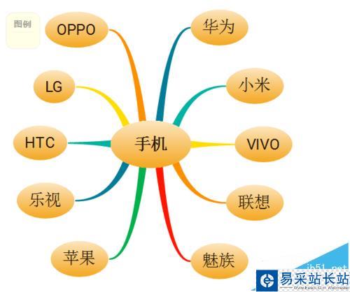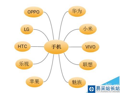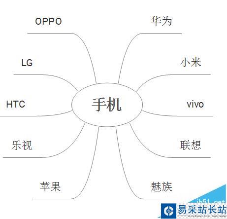 XMind軟件是思維導圖工具,其中有思維導圖、平衡圖、組織機構圖、樹狀圖、邏輯圖、魚骨圖和矩形。新建的空白圖中常用的是思維導圖,而每種圖形有各種設計風格,下面利用圖形設計手機品牌關聯圖,如下圖,具體操作如下: