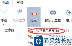 3、獨(dú)立顯示分支命令(導(dǎo)圖視圖和大綱視圖中均可用)只顯示選定的主題和其子主題。獨(dú)立顯示分支的作用在于,可以集中注意力于特定的主題,這在會(huì)議中展示較大導(dǎo)圖時(shí)特別有用,讓觀察者能夠查看主題的細(xì)節(jié)而不被導(dǎo)圖的剩余部分分心。在視圖選項(xiàng)卡上,過濾器組里,點(diǎn)擊分支下拉按鈕,選擇獨(dú)立顯示分支,或按F4。