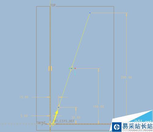 3、繪制一條中心線、一個斜線,并在斜線上取兩點(diǎn),其尺寸關(guān)系如下圖;