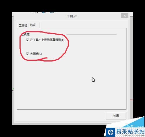 5、在工具欄窗口中點擊“選項”,還可修改工具欄“在工具欄顯示屏幕提示”這個是當你把鼠標移動到任意工具時,會顯示出它的名稱和簡單的作用。建議新手勾選該選項。還有一個改變工具圖標大小的。