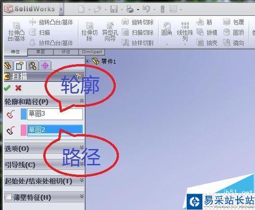 7、在掃描命令 對話框中 把剛才繪制的 輪廓和路徑 加入進去