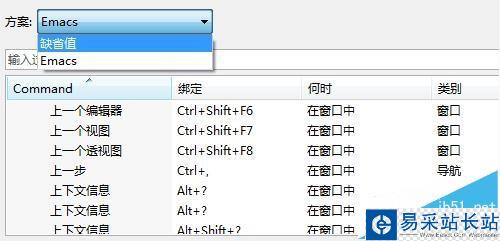 2、打開首選項對話框,點擊快捷鍵選項,出現快捷鍵設置窗口。在方案中,祖選擇快捷鍵設定的參照規格,缺省值是指XMind系統自身設定的規則,而Emacs則是宏編輯器的參照規則,用戶可根據自己的習慣選擇。