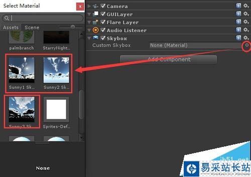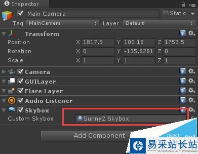 5)選擇過后,你可以在Inspector視圖中的Skybox組件中看到剛才選中的天空貼圖資源,這里我選擇Sunny2 Skybox,如下圖所示。