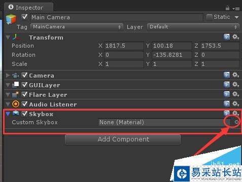 6)接著在Inspector視圖中可以看到添加了Skybox組件,點擊組件最右側的帶有點的小圓圈,如下圖所示。