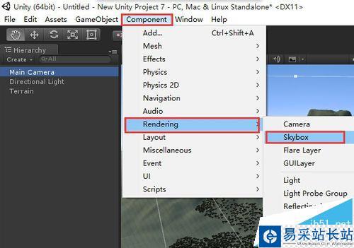 2)然后,點擊菜單欄上的“Component”按鈕,在彈出來的列表中點擊“Rendering”-->”Skybox“,如下圖所示。