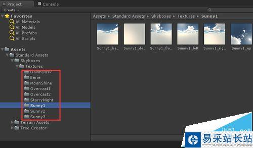 3、等待天空盒子導入完成,點擊Project視圖下的"Assets"-->“Skyboxes”-->"Textures",可以看到系統提供了9款天空貼圖資源,點擊其中的一個文件夾,可以看到里面,放置了6個面的貼圖材質,剛好對應前、后、左、右、上、下6個面。