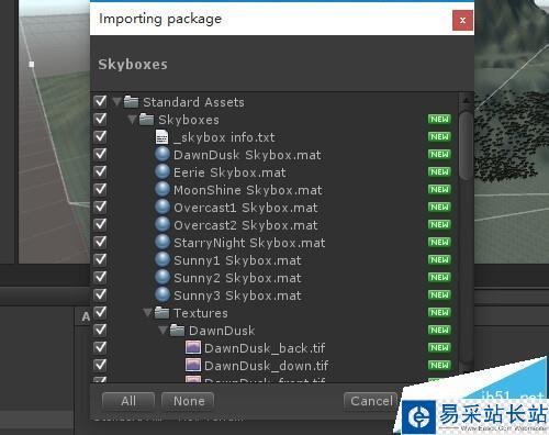 2、彈出一個“Import packages”窗口,選擇導入的天空盒子資源,這里一般默認就可以了,點擊“Import”按鈕,如下圖所示。