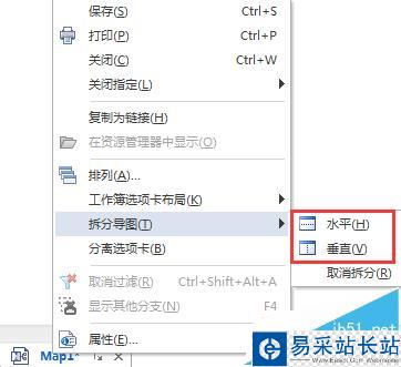 2、右擊導圖工作簿標簽,點擊水平拆分導圖或垂直拆分導圖。