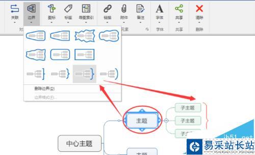 3、我們?cè)趯?dǎo)圖中,選擇需要插入大括號(hào)的導(dǎo)圖分支,點(diǎn)擊邊界下拉按鈕,選擇合適的摘要樣式。如下圖所示,要給圖中的三個(gè)子主題添加摘要,必須選定上級(jí)主題,不能選定中心主題或者子主題中的任何一個(gè)。
