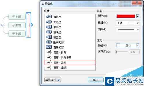 2、MindManager 2016的邊界樣式中,有四種摘要樣式,分別是折彎、斜角折彎、弧形、曲線:
