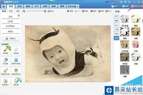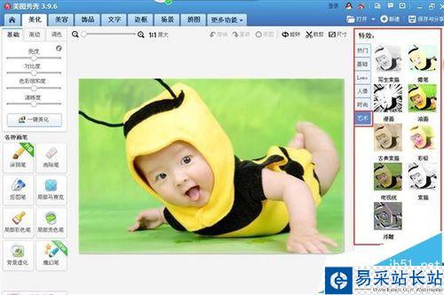 4、我們現(xiàn)在要把這張彩色照片制作成古典素描的圖片,我們?cè)?ldquo;美化”圖片的頁(yè)面右側(cè)看到有“特效”窗口,如下圖所示