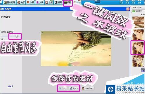 3、然后進入“閃圖”菜單下,利用一鍵閃效之水波紋,就可以做出水流動的效果。倒影的部分就這么輕松搞定了。當然閃速要根據需要適當調節一下,如圖5所示。
