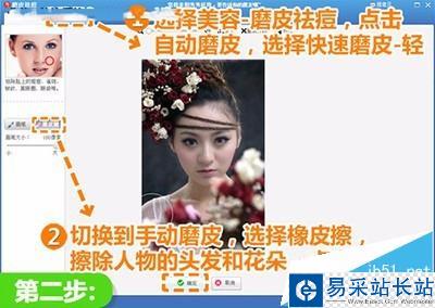 2、接著進入“美容”菜單下,選擇“磨皮祛痘”,先點擊“自動磨皮”,選擇“快速磨皮-輕”,這樣可以讓人物的皮膚變得更嫩滑;然后再切換到“手動磨皮”,選擇“橡皮擦”工具,擦除人物的頭發和花朵,還原一些小細節。
