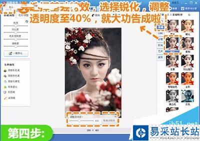 4、最后仍在“美化”菜單下,點擊“基礎”分類,選擇 “銳化”特效,將透明度調至40%,讓畫面更加的清晰人物也就更加突出,這樣就大功告成啦!
