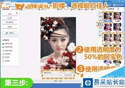 3、進入“美化”菜單下,點擊“影樓”分類,分別使用透明度為100%的“粉紅佳人”、透明度為50%“阿寶色”和透明度為30%的“淡雅”進行特效疊加,調節畫面色調使人物的膚色變得更加白皙動人!