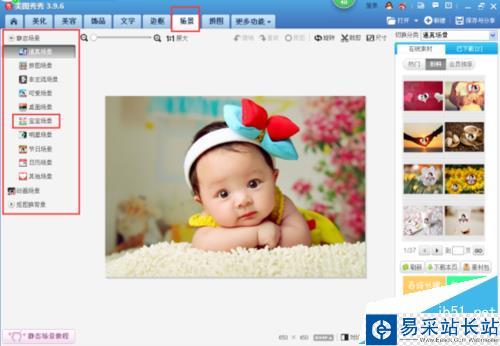 8、我們點(diǎn)擊“寶寶場(chǎng)景”,在“場(chǎng)景”的頁(yè)面右側(cè)視圖中我們看到彈出了“寶寶場(chǎng)景”的素材窗口,如下圖所示