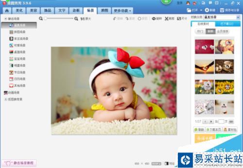 5、我們現(xiàn)在想把這張圖片放到一個(gè)特定的場(chǎng)景里,那么我們就在“美圖秀秀”的頁(yè)面菜單中找到“場(chǎng)景”,如下圖所示