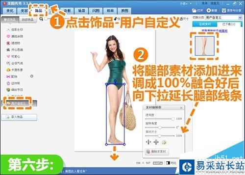 6、最后進入“飾品”菜單下,在“用戶自定義”中將摳圖的腿部素材選擇進來,將其保持100%原大和照片中的腿部融合好,然后用鼠標向下拉來延長腿部線條。