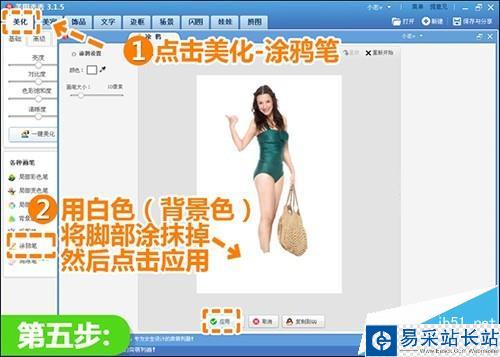 5、再點擊“美化-涂鴉筆”,用白色(背景色)將腳部涂抹掉,留下空間作為拉長腿部做準備。