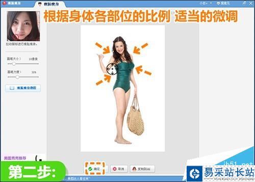 1、在“美圖秀秀”軟件下,進入“美容”菜單下選擇“瘦身瘦臉”功能,用合適的畫筆大小力度,將身體微胖的部位向內推。