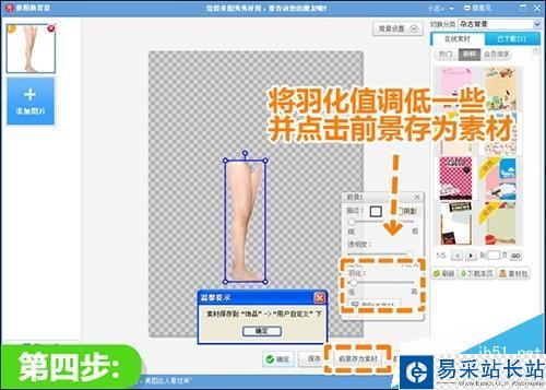 4、跳轉到新界面后,將摳圖素材的羽化值調低一些,然后點擊“前景作為素材”,將摳圖素材存入“飾品-用戶自定義”中備用。
