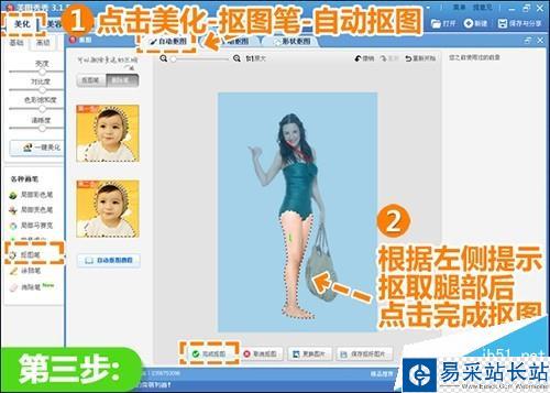 3、完美瘦身后進入“美化”菜單下,選擇“摳圖筆-自動摳圖”功能,用摳圖筆劃出腿部路徑,不需要的部分可以用刪除筆劃掉,然后點擊“完成摳圖”。