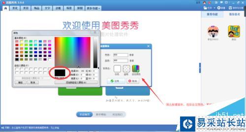 2、首先我們先打開美圖秀秀。點開‘新建’,一般在右上角,彈出‘新建畫布’窗口,選擇自定義顏色,黑純色