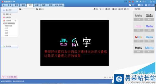 3、做完以上兩步就要步入正題了。輸入字體,右擊畫布合并所有素材【這一步就看圖片吧,我懶得打字了嘻嘻】,素材中選一張,右擊畫布,點擊插入圖片,插入所選的西瓜字素材,圖片放大,拉到適合位置,中間的黑線對齊字體中心 ,覆蓋全字體【我沒有覆蓋是要留出對比給你們】,右擊畫布正片疊底