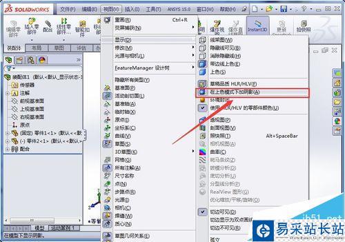 2、在彈出的下拉菜單中會(huì)發(fā)現(xiàn)此時(shí)“上色模式中的陰影”功能處于激活狀態(tài),左鍵單擊該選項(xiàng)即可將此功能抑制;
