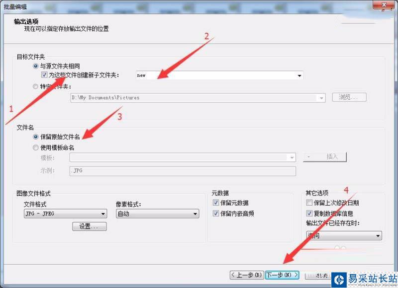 8、輸入選項的設置中,建議目標文件夾,與源文件相冊,勾選,為這些文件創(chuàng)建新子文件夾new,這樣便于管理和比較文件名,則 保留原始文件名接著點擊下一步繼續(xù)