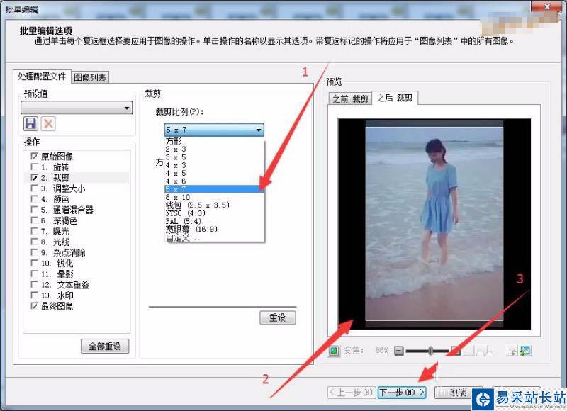 7、默認裁剪方式不能滿足我們的需要,可逐一從裁剪比例下拉菜單中進行選擇,如果都不滿意可選擇自定義比例.5x7滿足了我們的要求,選擇后,點擊下一步