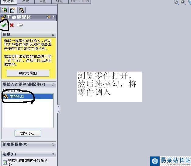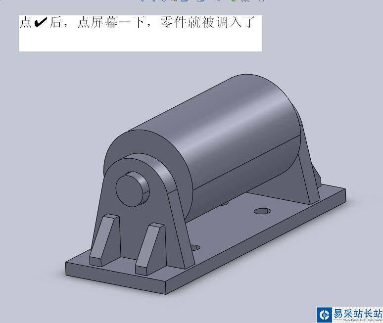 4、選一下裝配體的零件,選擇√,點擊屏幕一下,零件就被調入到了solidworks中了。