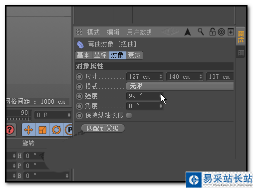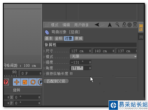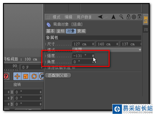 6、強度的數值可以是正數,也可以是負數。數值是負數的,扭曲的方向與正數扭曲的方向剛好是相反的。但我們如果調節角度的數值,即使強度的數值是負數,但如果調節角度的數值,也可以把管道彎曲的方向轉回強度正數的方向。
