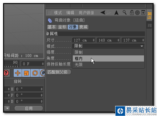 4、再把模式設置為:框內;然后,在強度這里增加數值。視圖上的管道即彎曲了。
