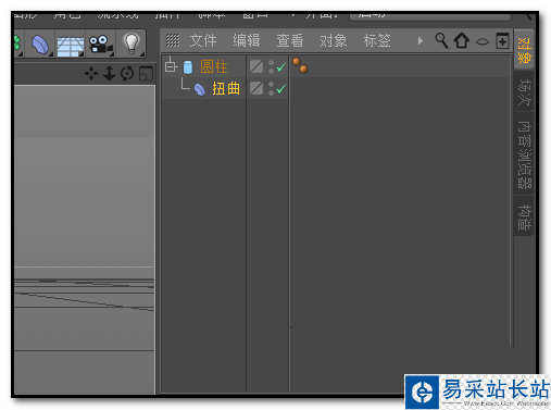 2、創建扭曲對象,視圖上顯示出扭曲的紫色方框。鼠標點住扭曲對象,把扭曲對象拉到管道對象下級。