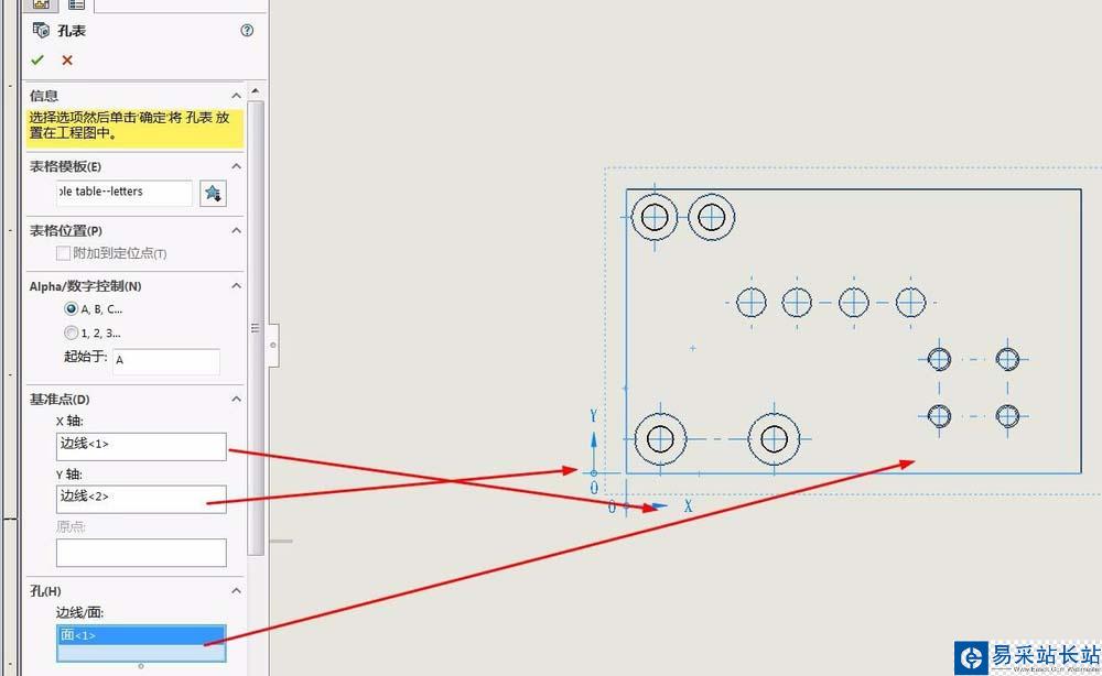 3、分別選取x軸和y軸,也可以直接選擇一個點作為原點。另外需要選擇一個面.點擊確認,則孔的位置是以原點為基準來表示的。