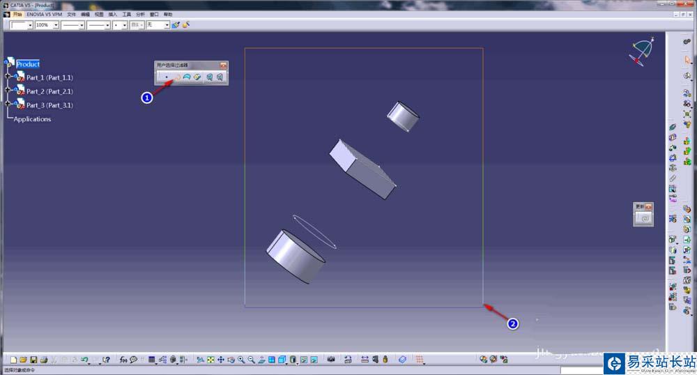 1、首先我們打開任意一個CATIA裝配體模型,可以看到模型中共有三個零件,他們的基準面以及草圖都顯示在三維界面中,在建模完成以后,這些元素已經沒有需要被隱藏起來;