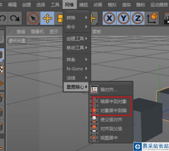 6、如果,想將坐標回復到原來狀態,怎么辦呢。在網絡菜單欄選"重置軸心",選軸居中到對象,即可。