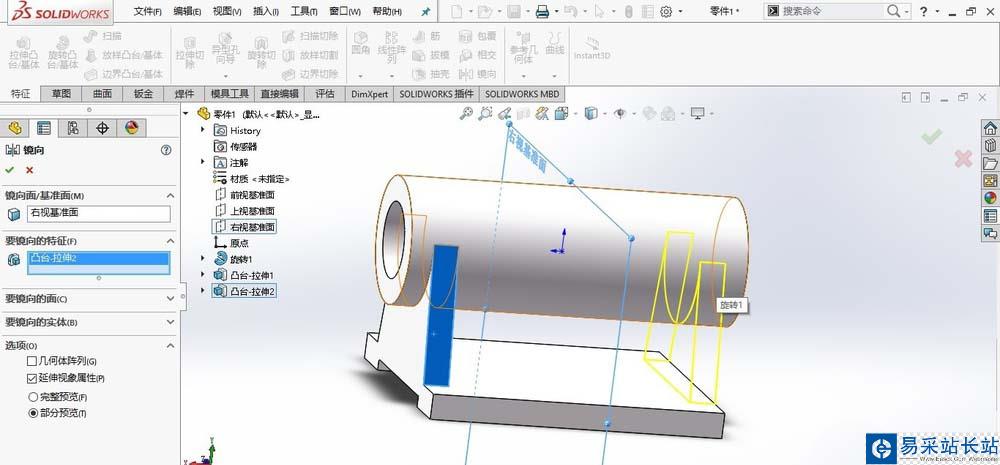 7、單擊特征,“鏡像”命令,鏡像面選擇右視基準面,鏡像特征選擇“凸臺-拉伸2”,單擊確定,完成鏡像。