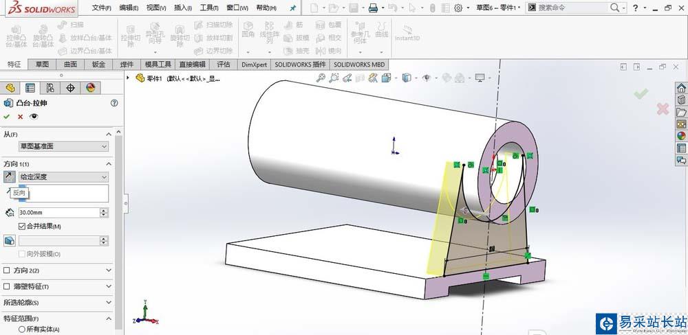 6、單擊特征,“拉伸凸臺/基體”命令,點擊“反向”,深度設置為“30 mm”,單擊確定,完成拉伸特征的創建。
