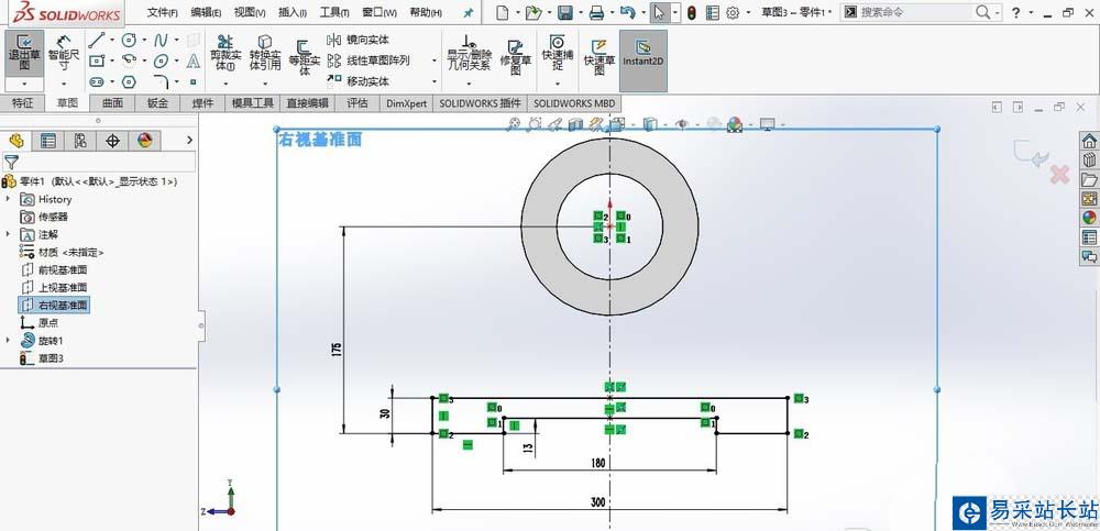 3、正視于右視基準面,在右視基準面上繪制草圖。繪制具有如圖所示幾何關系的草圖。