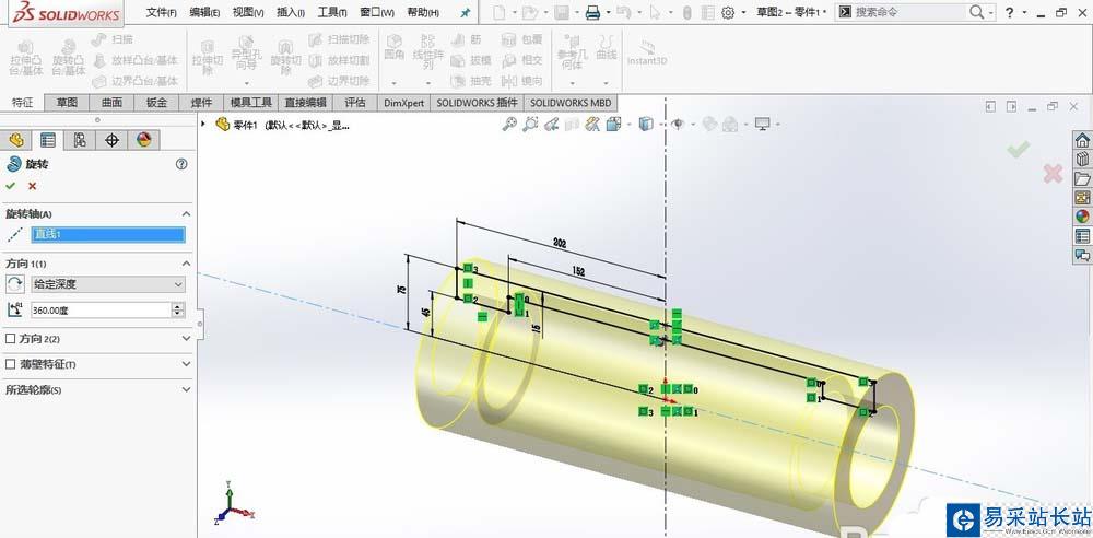 2、單擊特征,“旋轉凸臺/基體”命令,選擇如圖所示中心線作為旋轉軸,其它參數保持默認,單擊確定,生成旋轉凸臺。