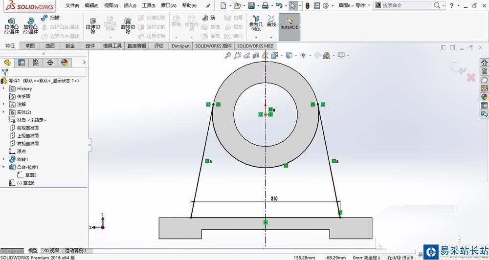 1、打開SolidWorks2016,新建一個零件模型。選擇前視基準面,繪制草圖。繪制具有如圖所示幾何關系的草圖。
