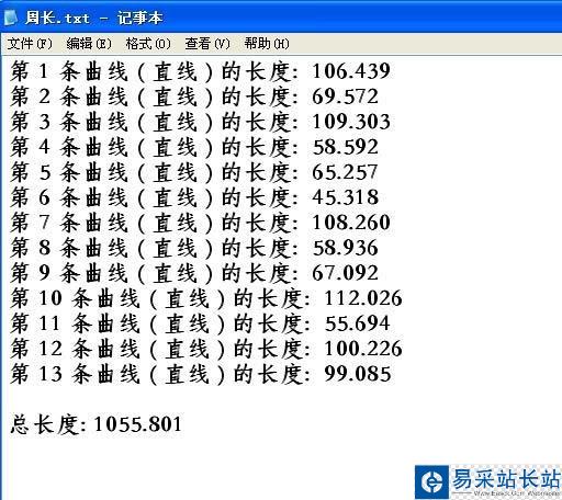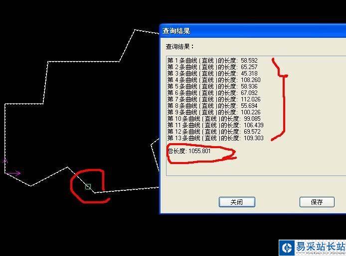 3、這時候光標變為小方框,選擇需要測量的線段。點擊后自動彈出測量的數據。數據表可以清楚的看到每個線段的長度,總長度都在內。