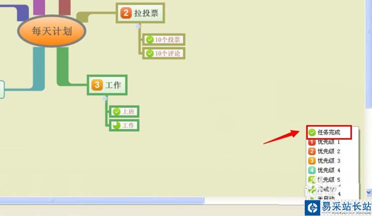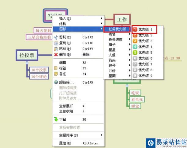 4、在每天計劃的子主題中,點擊鼠標右鍵進行圖標優先級的標記。(如下圖)