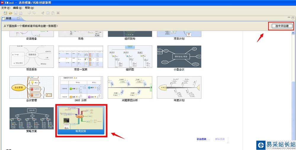 1、打開XMind后,選擇“每周安排”的模板來進行套用和創建,雙擊選中并打開每周安排模板,然后單擊選中,然后再點擊右上角的“選中并創建”按鈕。(如下圖)