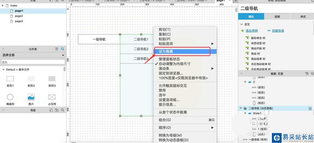 2、將二級導航和三級導航都轉換成動態面板,各自取名:二級導航,三級導航。同時對一級導航添加交互用例:“選中當前元件,顯示二級導航,隱藏三級導航。”