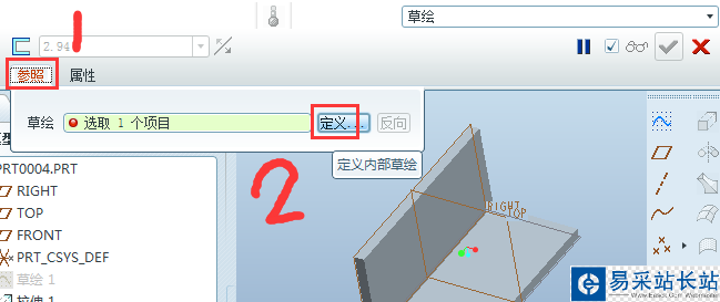 3、系統(tǒng)打開如下所示的“筋”控制面板,點擊“參照”(step1),然后點擊“草繪”后面的“定義”(step2)。